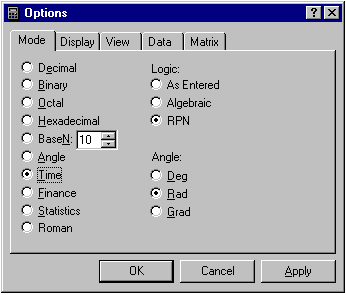 The Angle and Time modes allow display and input as sexagesimal numbers. In Time mode a stopwatch feature is also available.Roman