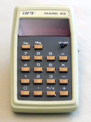 The APF MARK 43 is an arithmetic calculator with 8 digits precision and algebraic logic. It has 5 functions, 18 keys, and an LED (light-emitting diode) display typical of calculators of this era. The power source is PP3 9V battery.