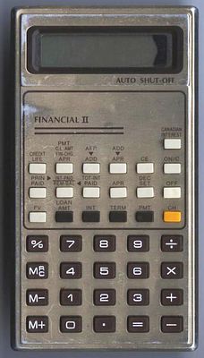 The Calculated Industries FINANCIAL I is a finance calculator with algebraic logic. It has 34 keys, and an LCD (liquid crystal) display.